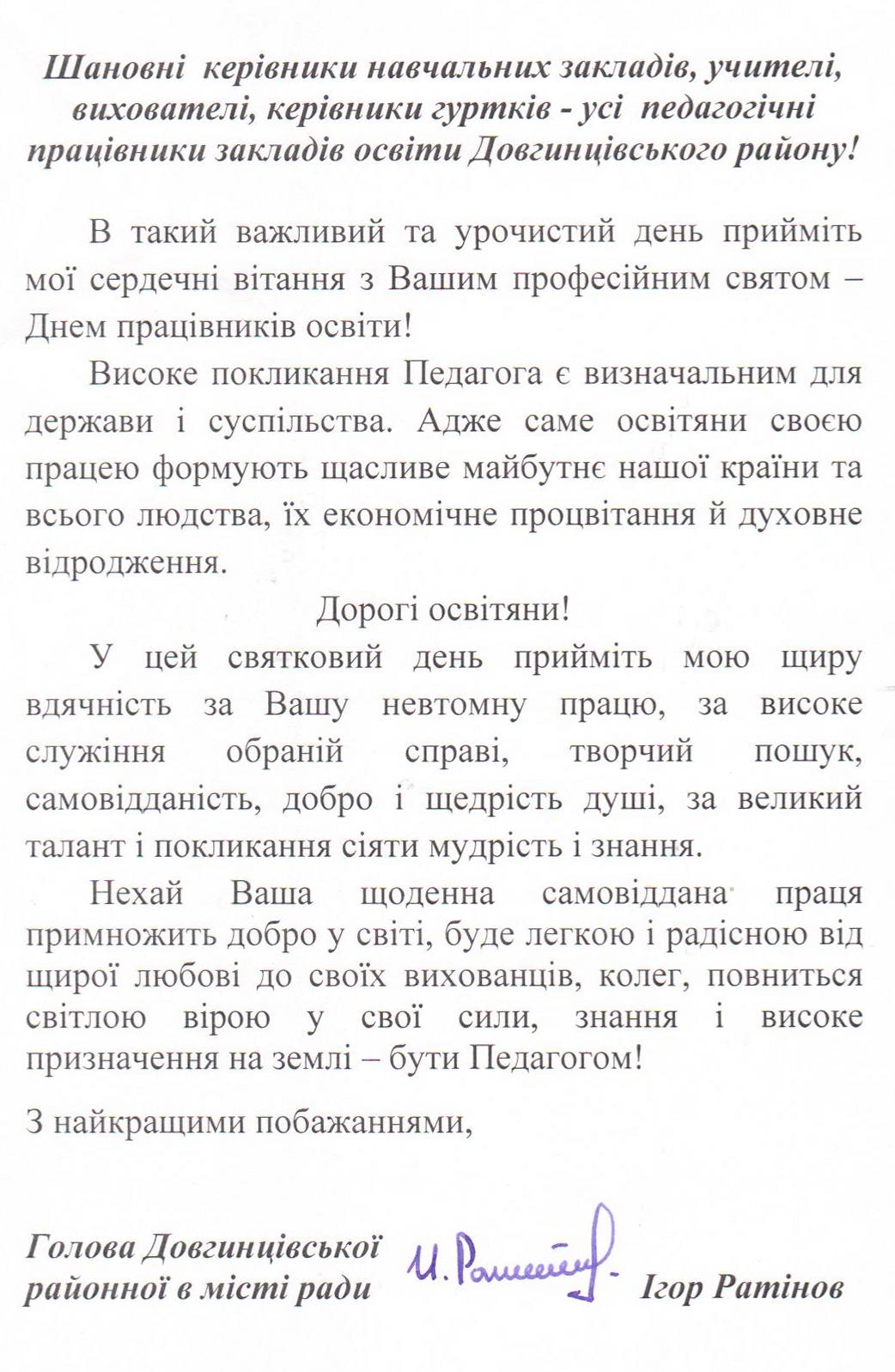 Шановні керівники навчальних закладів, учителі, вихователі, керівники гуртків - усі педагогічні працівники закладів освіти Довгинцівського району!