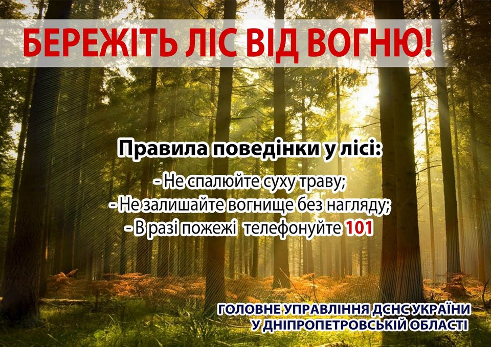 Шановні громадяни! Якщо ви помітили загорання в лісах, на відкритих територіях, негайно телефонуйте за номером «101». Пам’ятайте, що лише дотримання елементарних правил пожежної безпеки застереже від трагічних наслідків.