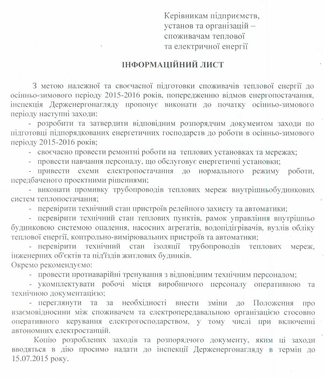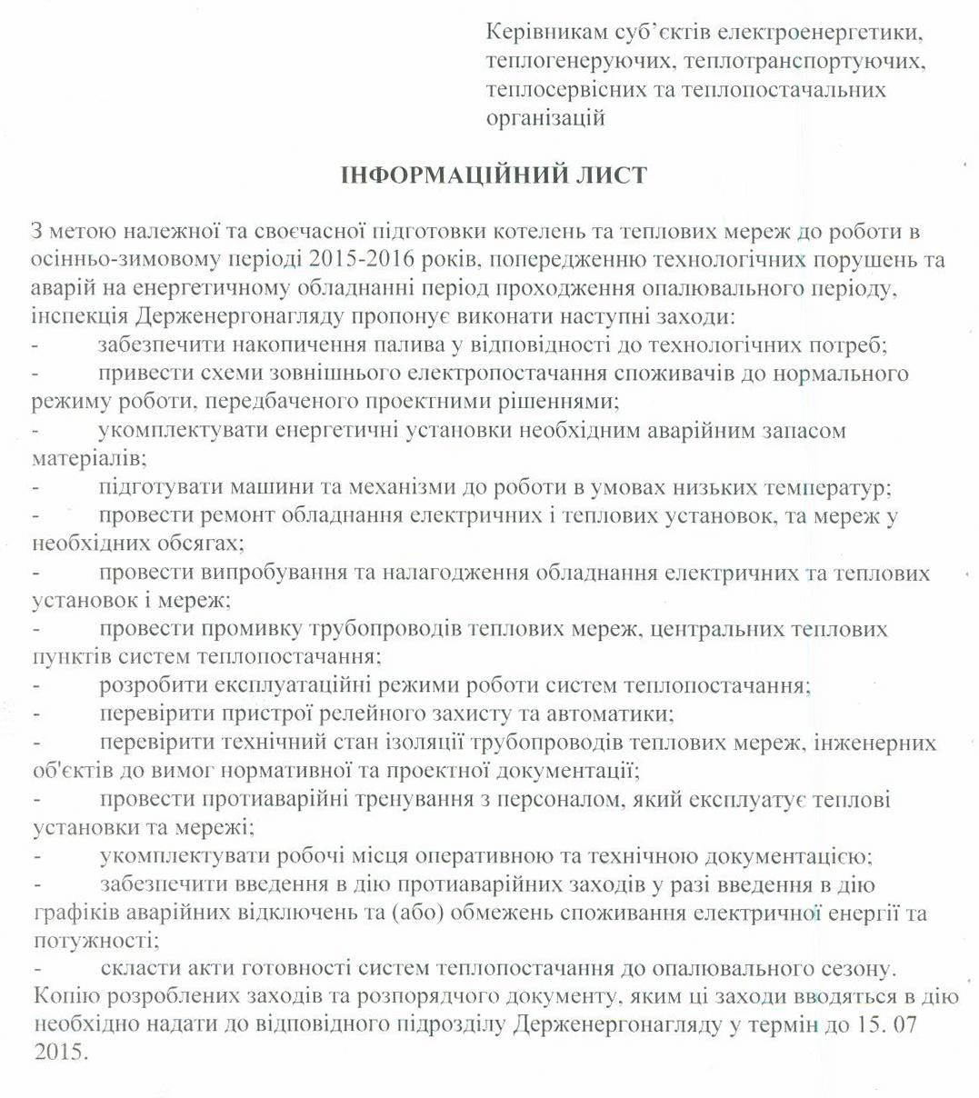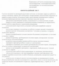 Інформаційний лист Криворізького відділення інспекції Держенергонагляду у Дніпропетровській області