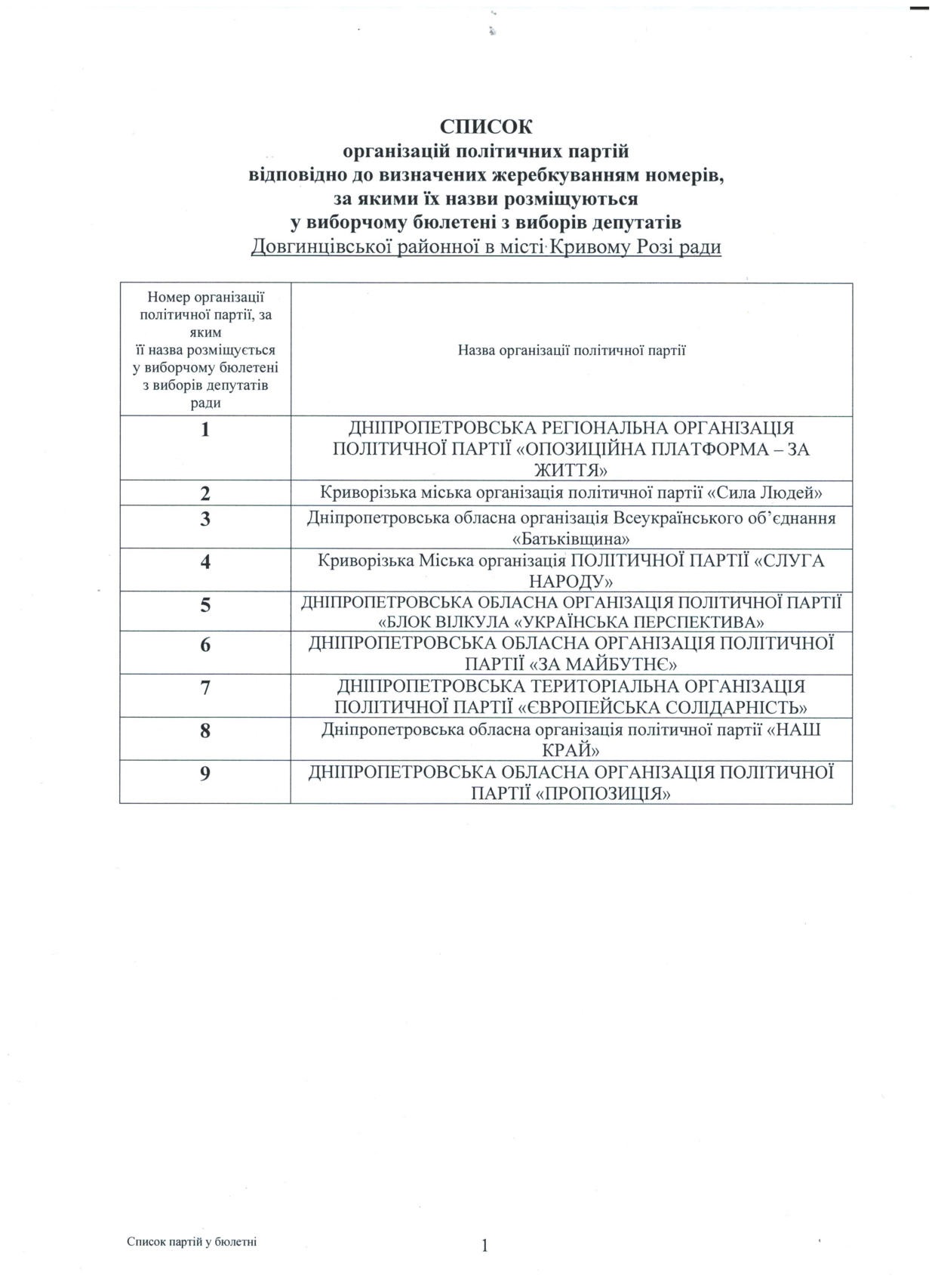 Список організацій політичних партій відповідно до визначених жеребкуванням номерів, за якими їх назви розміщуються у виборчому бюлетені з виборів депутатів Довгинцівської районної в місті Кривому Розі ради