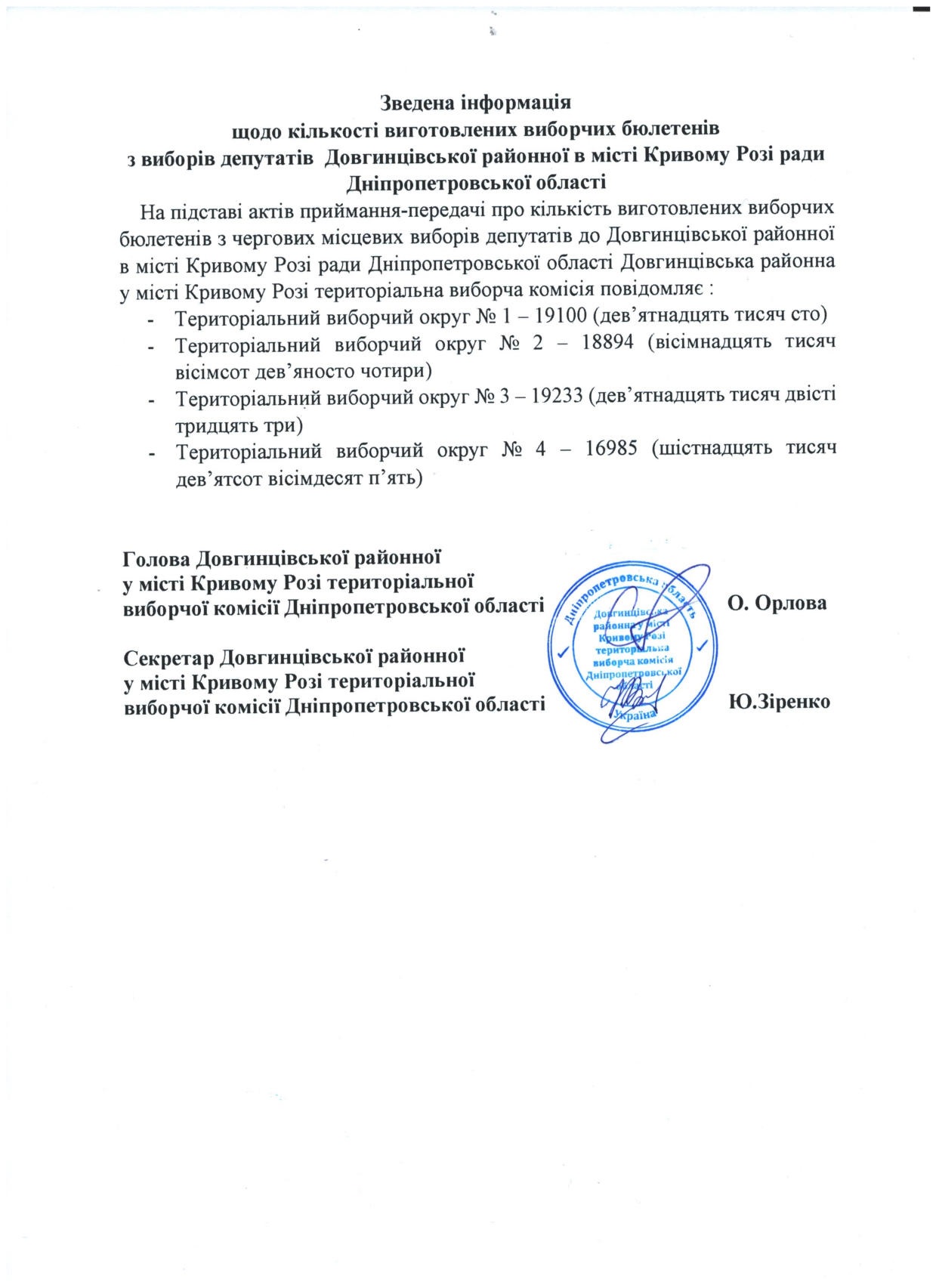 Зведена інформація щодо кількості виготовлених виборчих бюлетенів з виборів депутатів Довгинцівської районної в місті Кривому Розі ради Дніпропетровської обасті