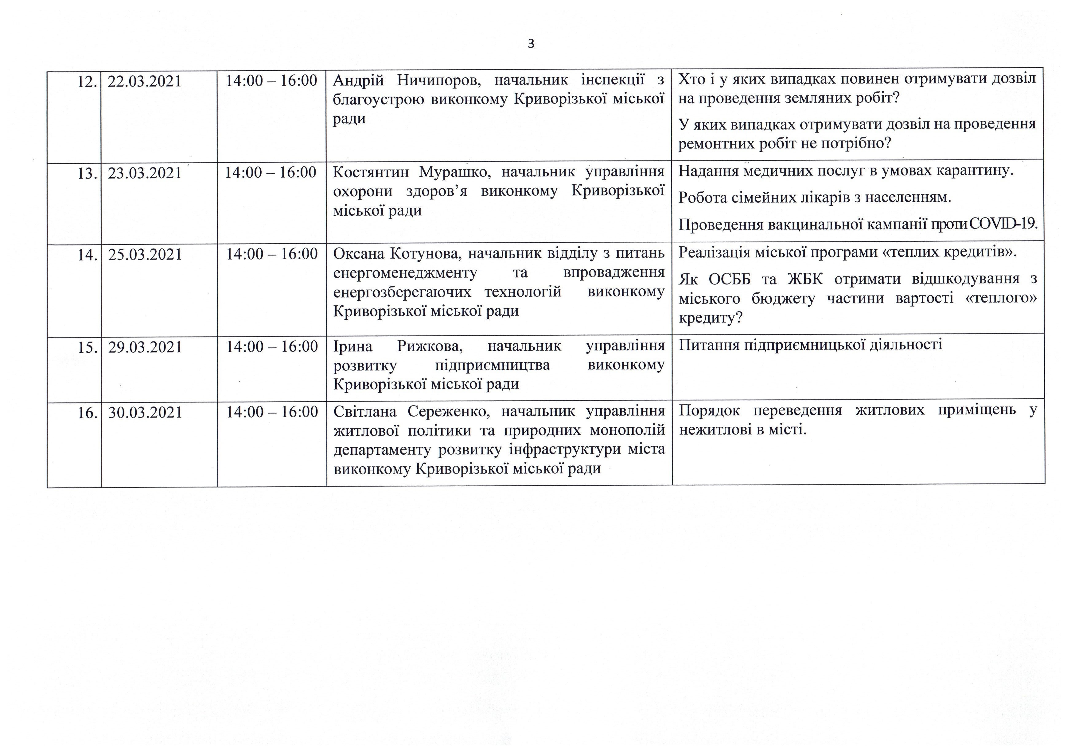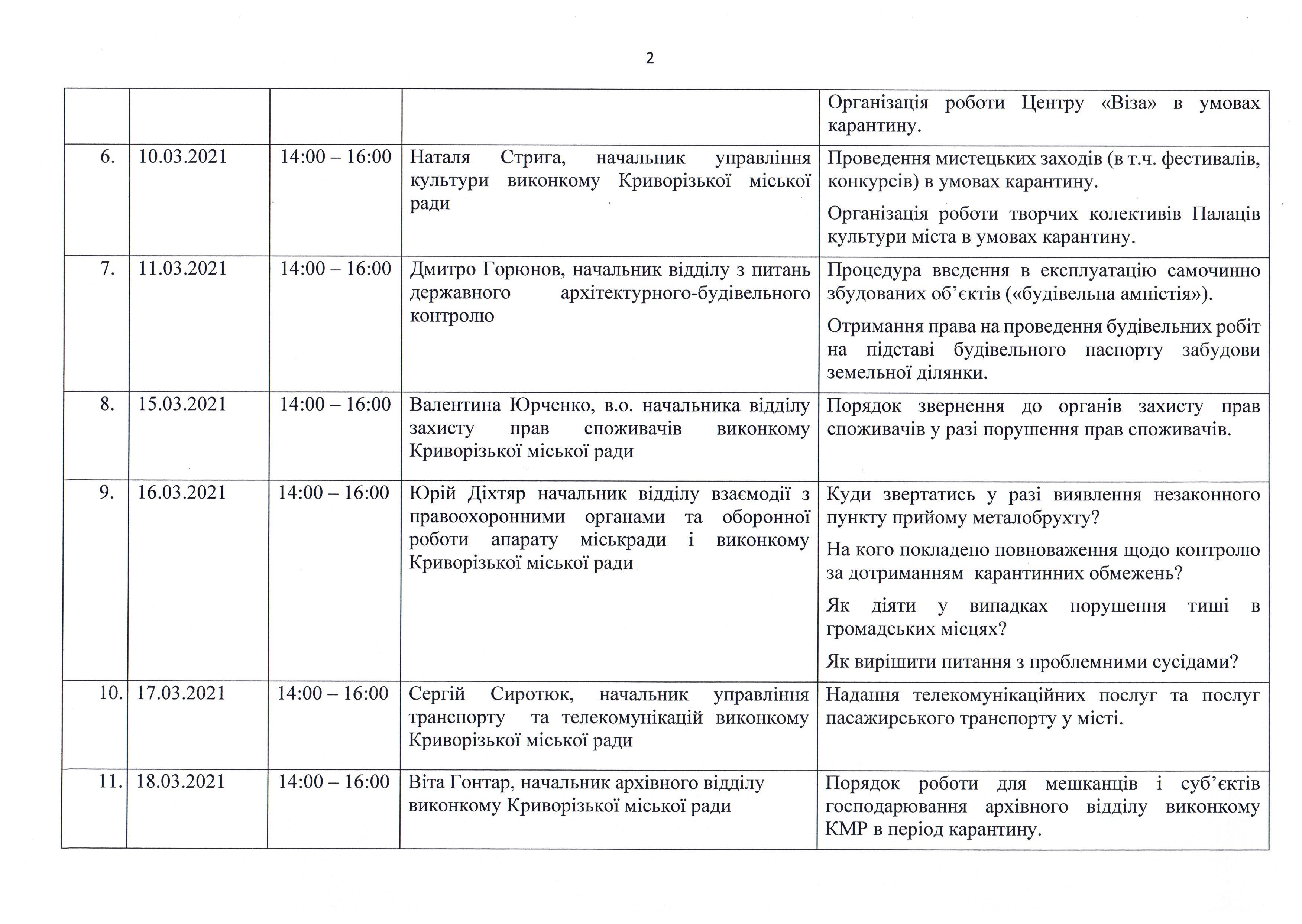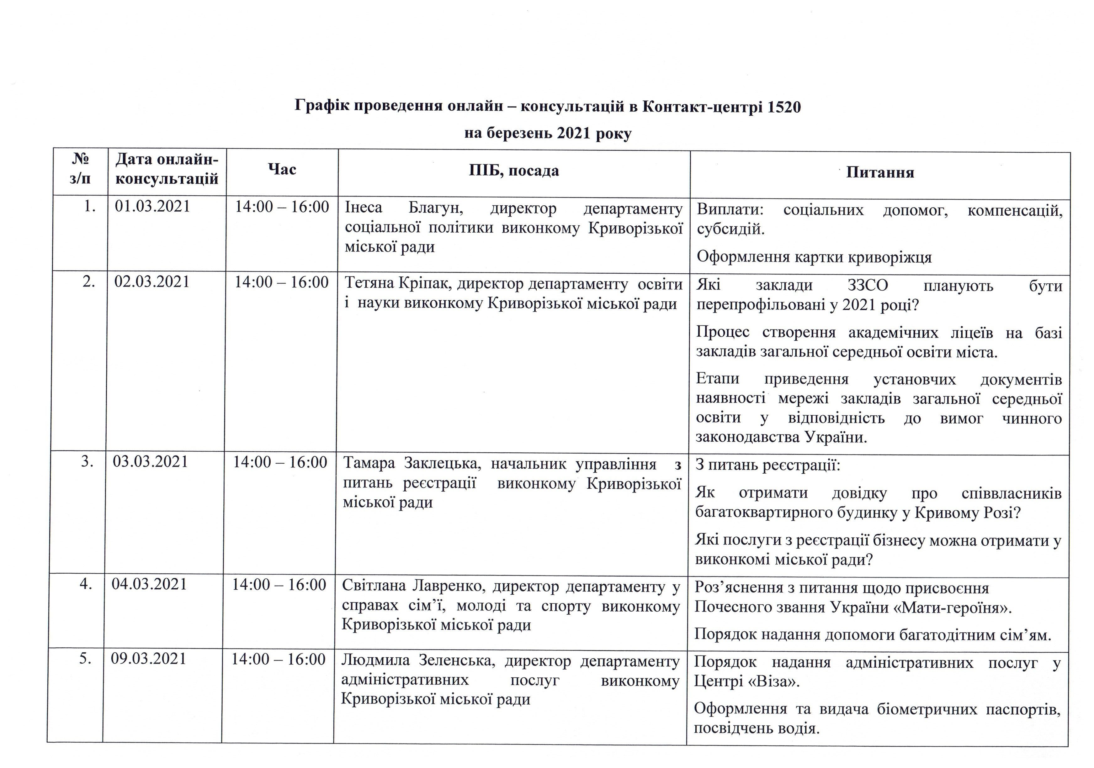 Графік онлайн-консультацій у Контакт-центрі 1520 керівників структурних підрозділів виконкому Криворізької міської ради на березень 2021 року