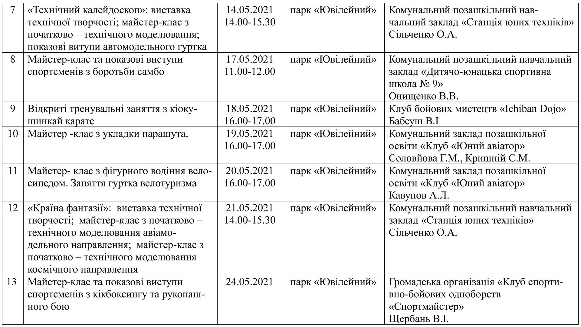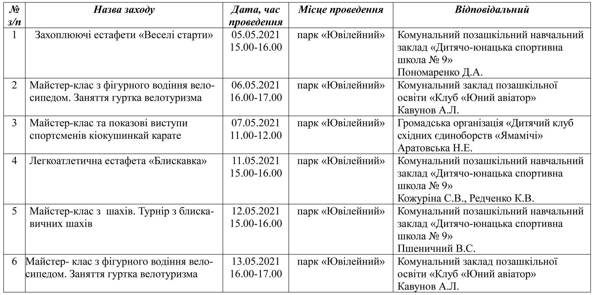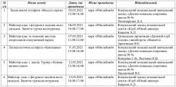 План заходів з проведення соціального проєкту «Активні парки - локації здорової України» на травень 2021 року