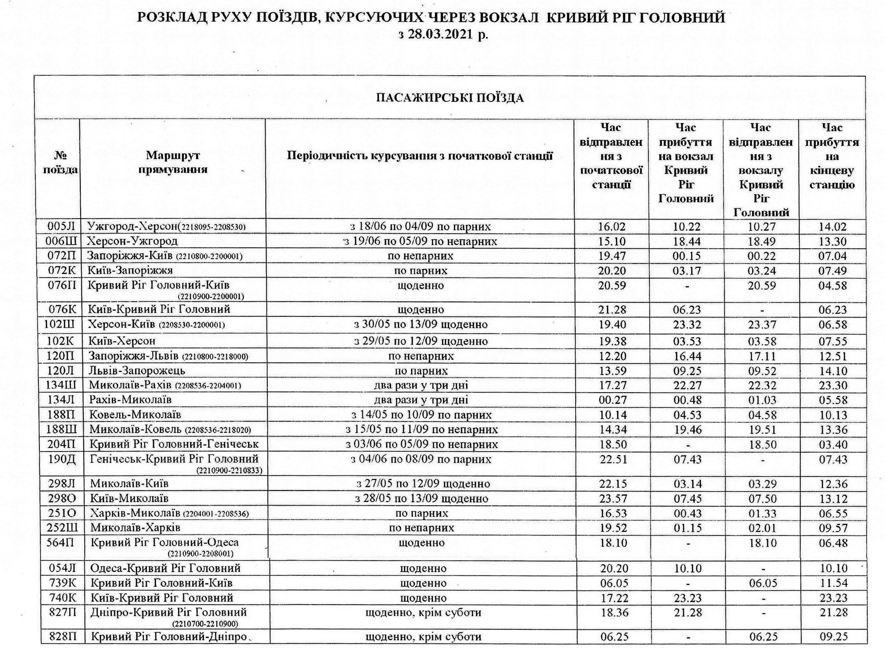 Доводимо до Вашого відома, що розпочали рух додаткові поїзди, які курсують через вокзал «Кривий Ріг-Головний» за напрямками до міст: Херсон, Ужгород, Київ, Запоріжжя, Львів, Миколаїв, Рахів, Ковель, Генічеськ, Харків, Одеса, Дніпро.