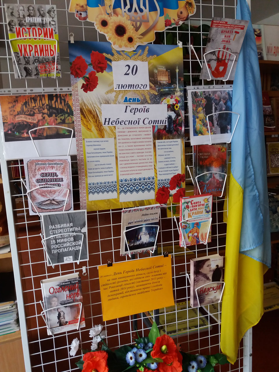 - оформлено тематичні книжкові виставки «Україна – країна героїв», «Поезія народжена Майданом», «Подвиг – безсмертний, пам’ять – жива», «Герої не вмирають»;
