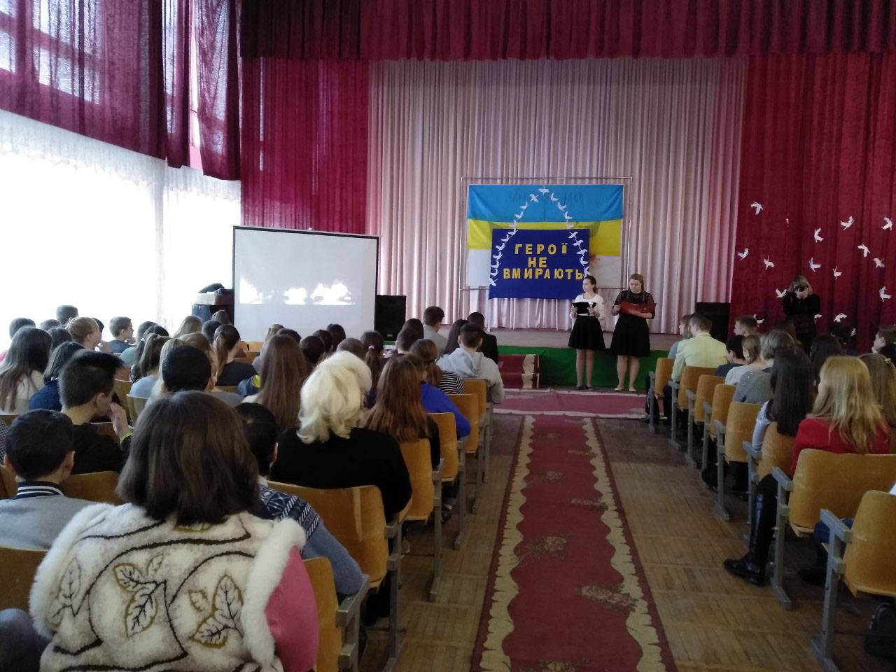 - єдині виховні години, єдині уроки пам’яті, класні виховні години, тематичні уроки, на теми: «Вони живуть у наших серцях…», «Щоб у піснях лишилися назавжди і Україну славою вінчати!», «Небесній сотні шана й молитви»;