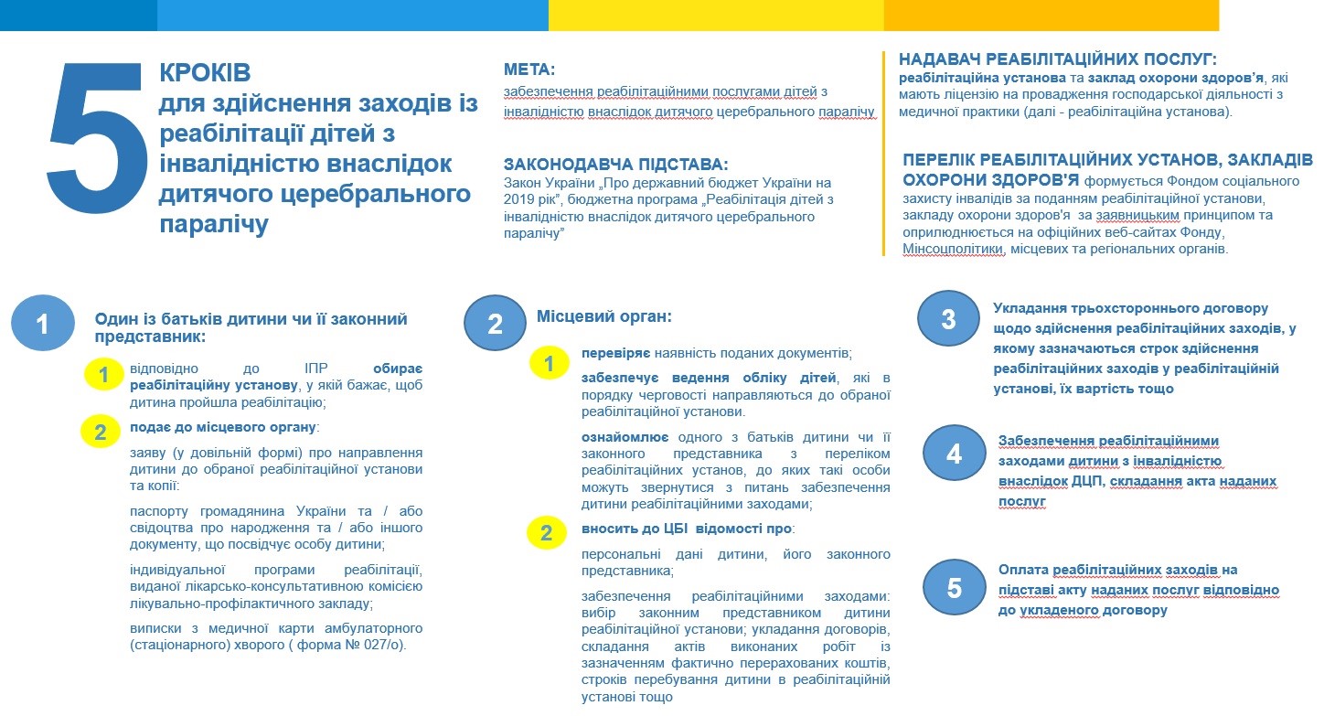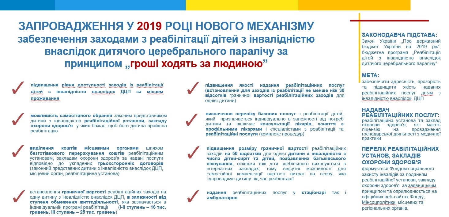 Запровадження у 2019 році нового механізму забезпечення заходами з реабілітації дітей з інвалідністю внаслідок дитячого церебрального паралічу за принципом «гроші ходять за людиною»