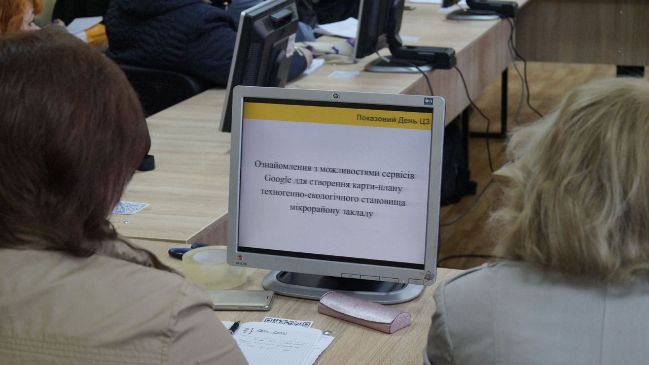 Присутні мали змогу ознайомитися з можливостями сервісів Google для створення карти-плану техногенно-екологічного становища мікрорайону закладу та взяти участь у відпрацюванні дій учнів, постійного складу школи, елементів практичного тренування для закріплення теоретичних знань щодо дій у надзвичайних ситуаціях соціального характеру.