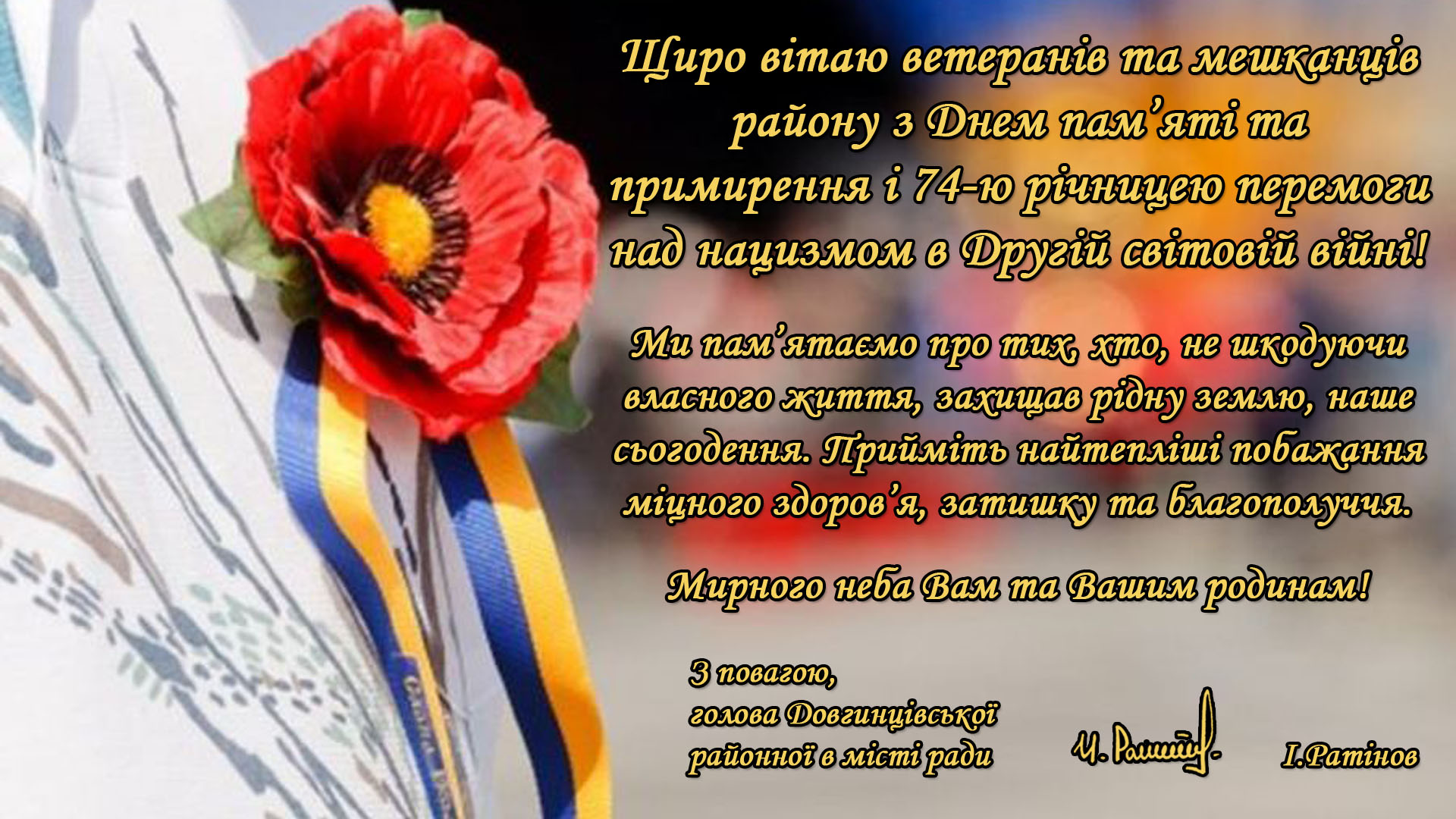 Щиро вітаю ветеранів та мешканців району з Днем пам’яті та примирення і 74-ю річницею перемоги над нацизмом в Другій світовій війні!