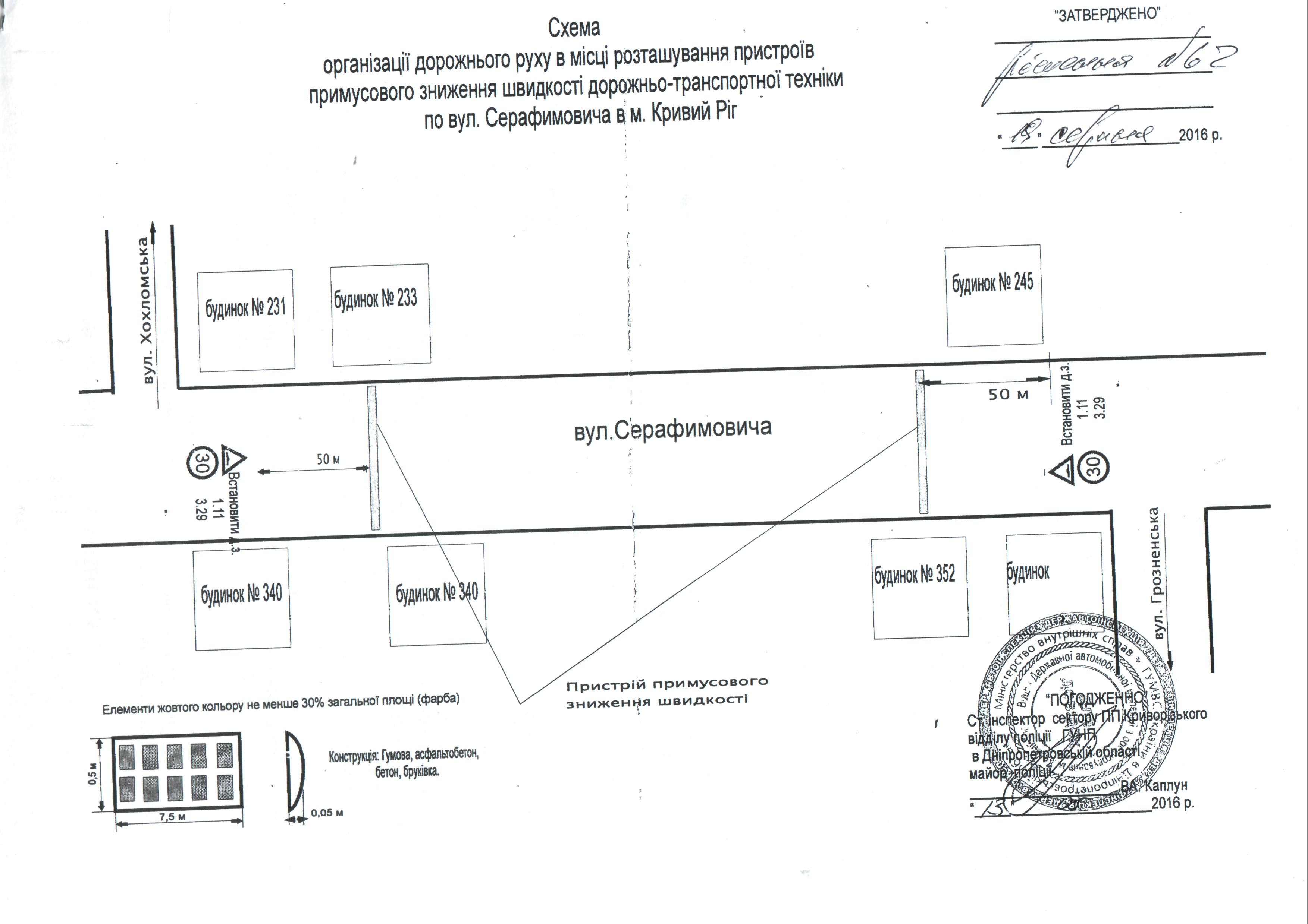 № 62 Про організацію дорожнього руху в місці розташування пристроїв примусового зниження швидкості дорожньо-транспортної техніки по вулиці Серафимовича в м.Кривий Ріг