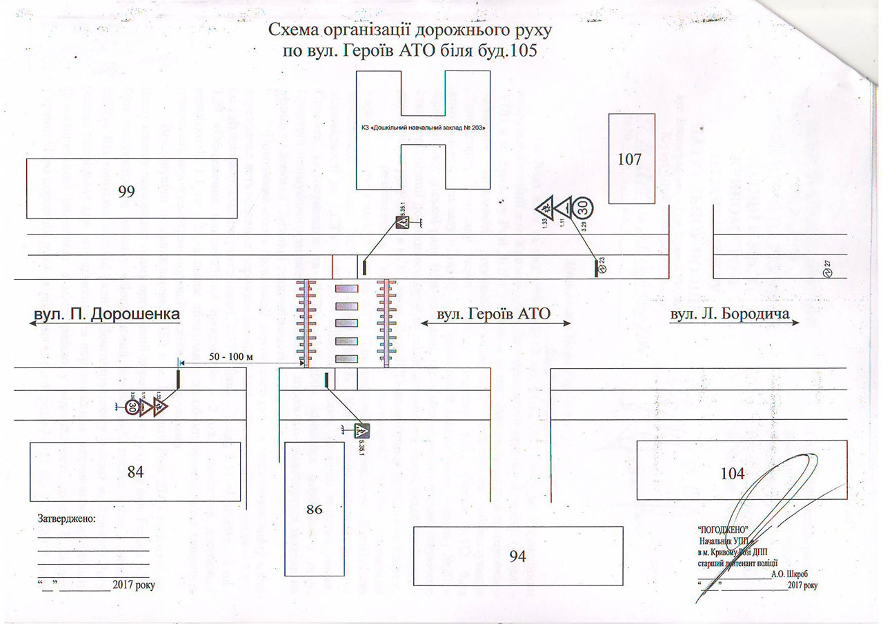 № 162 Про затвердження схеми організації дорожнього руху по вул. Героїв АТО, 105 в Довгинцівському районі