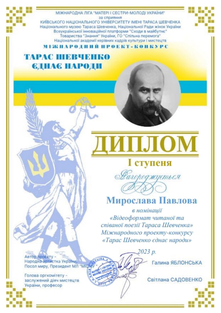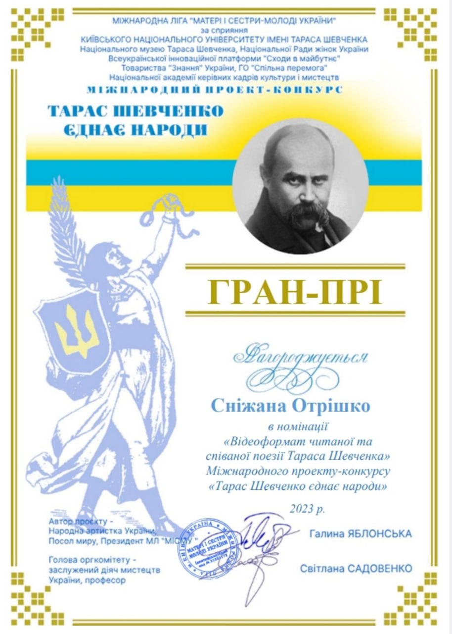 Талановиті учні вокального відділу КЗСМО «Музична школа №11» КМР (викладач Сніжана Отрішко) прийняли участь у Міжнародному проєкті-конкурсі «Тарас Шевченко єднає народи» за сприяння Київського національного університету імені Тараса Шевченка і стали переможцями.