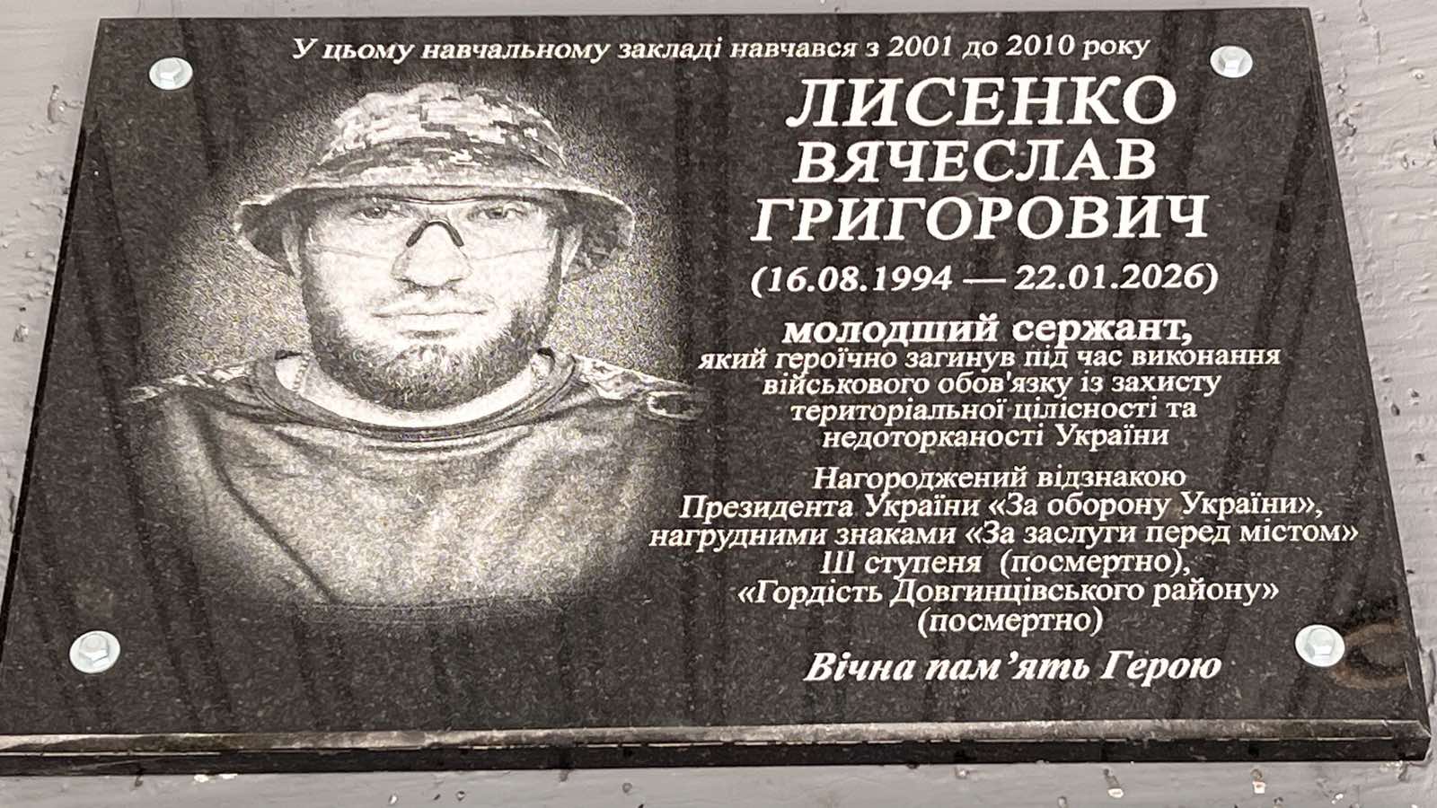 В’ячеслав Лисенко, молодший сержант, радіо телефоніст-лінійний наглядач 1-го механізованого взводу мінометної батареї 2-го механізованого батальйону. Героїчно загинув 22.01.2026 року в бою, в районі населеного пункту Графське, Харківської області, захищаючи незалежність та територіальну цілісність України.