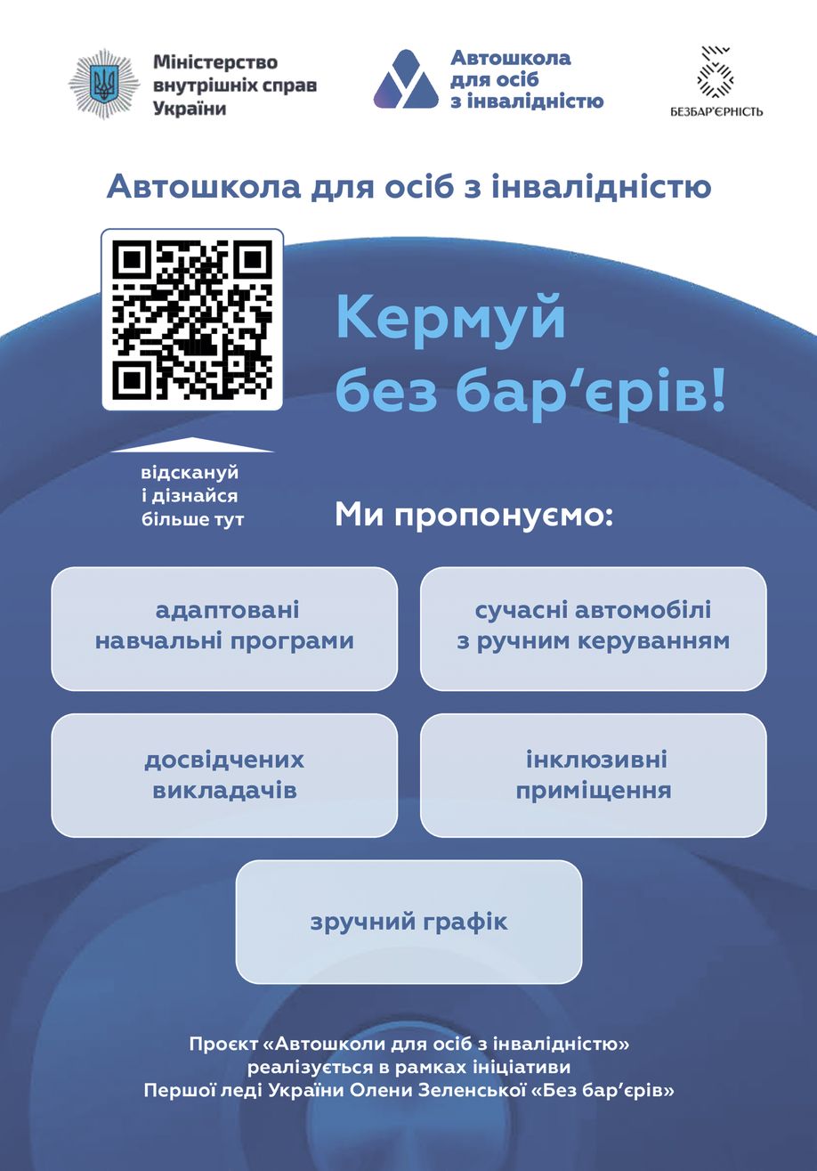 Міністерство внутрішніх справ України реалізує флагманський проєкт «Автошколи для людей з інвалідністю» в рамках загальнодержавної ініціативи Першої леді України Олени Зеленської «Без бар’єрів», для осіб з інвалідністю з порушенням опорно-рухового апарату для отримання ними посвідчення водія, які прагнуть отримати посвідчення водія та керувати транспортним засобом з ручним керуванням (інформація щодо порядку отримання послуги доступна за посиланням (https://driveability.mvs.gov.ua).