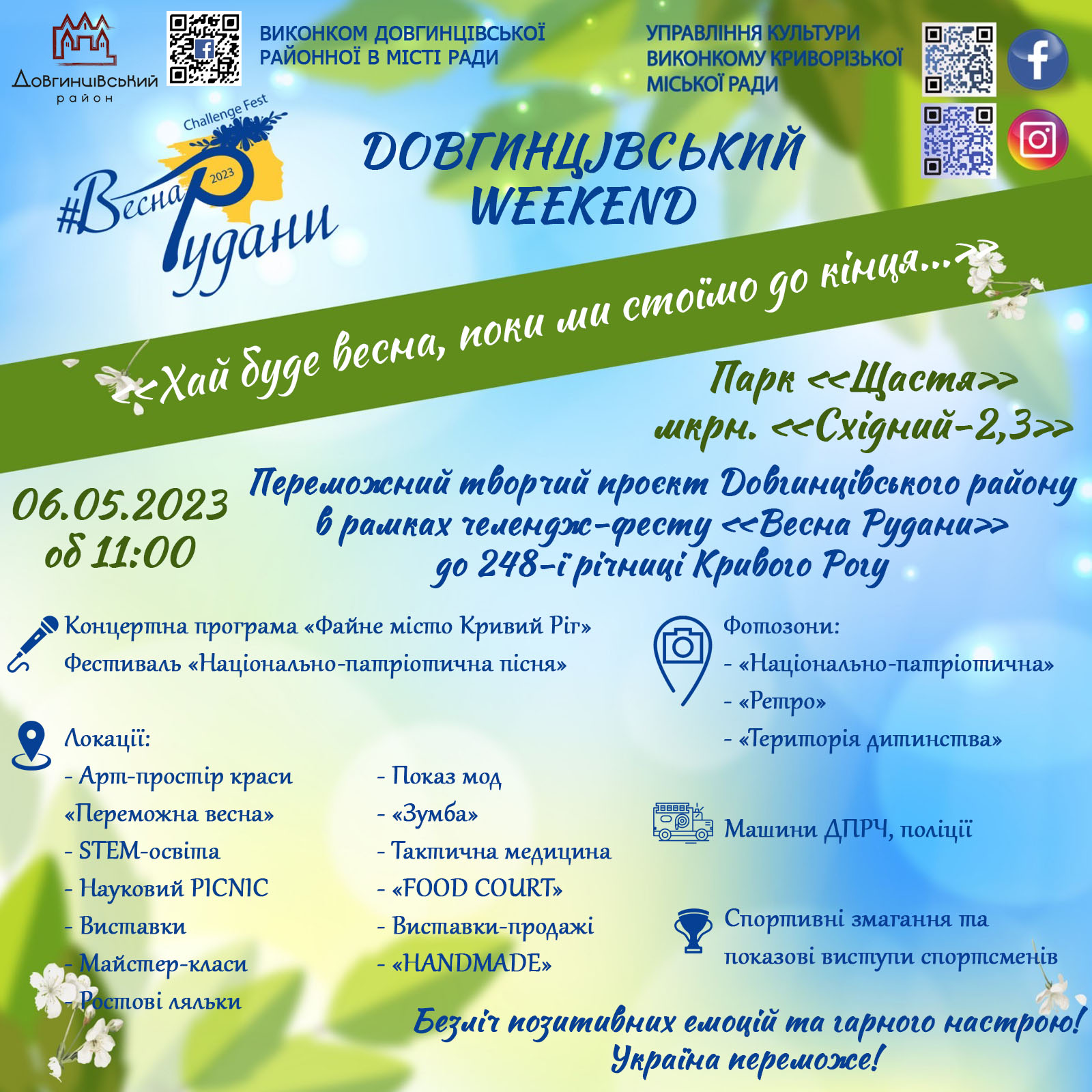 Запрошуємо на мистецький Weekend у Довгинцівському районі з нагоди 248-ї річниці заснування Кривого Рогу в рамках челендж-фесту #ВеснаРудани «Хай буде весна, поки ми стоїмо до кінця…».
