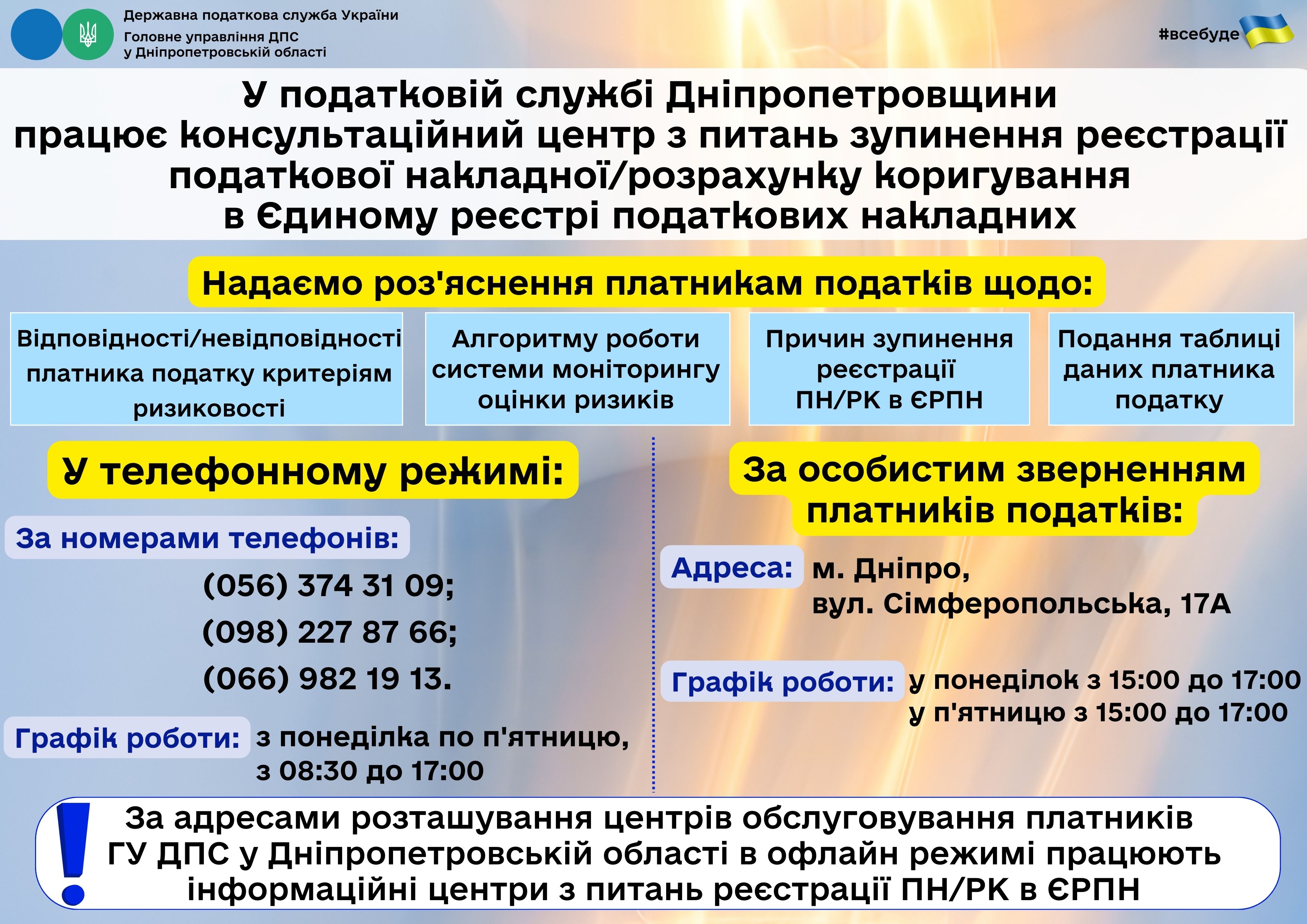Для зручності та допомоги бізнесу 04.02.2025 на Дніпропетровщині запрацював консультаційний центр з питань зупинення реєстрації податкової накладної/розрахунку коригування в Єдиному реєстрі податкових накладних (далі – консультаційний центр).