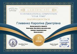 Перше місце на VI International competition «Star Time» та друге місце в міжнародному конкурсі «Volny a nezavisly» Praha, Ceska Republika (викладач Отрішко Сніжана Михайлівна, концертмейстер Стадник Павло Павлович).