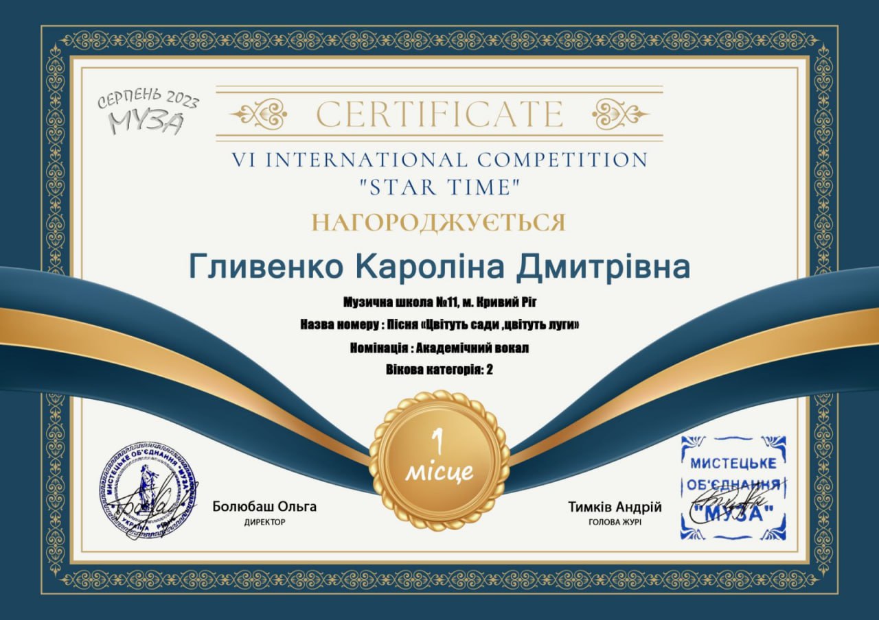 Вітаємо Гливенко Кароліну, вихованку вокального відділу Комунального закладу спеціалізованої мистецької освіти «Музична школа №11» з перемогою одразу у двох конкурсах!