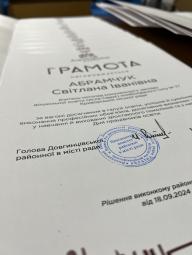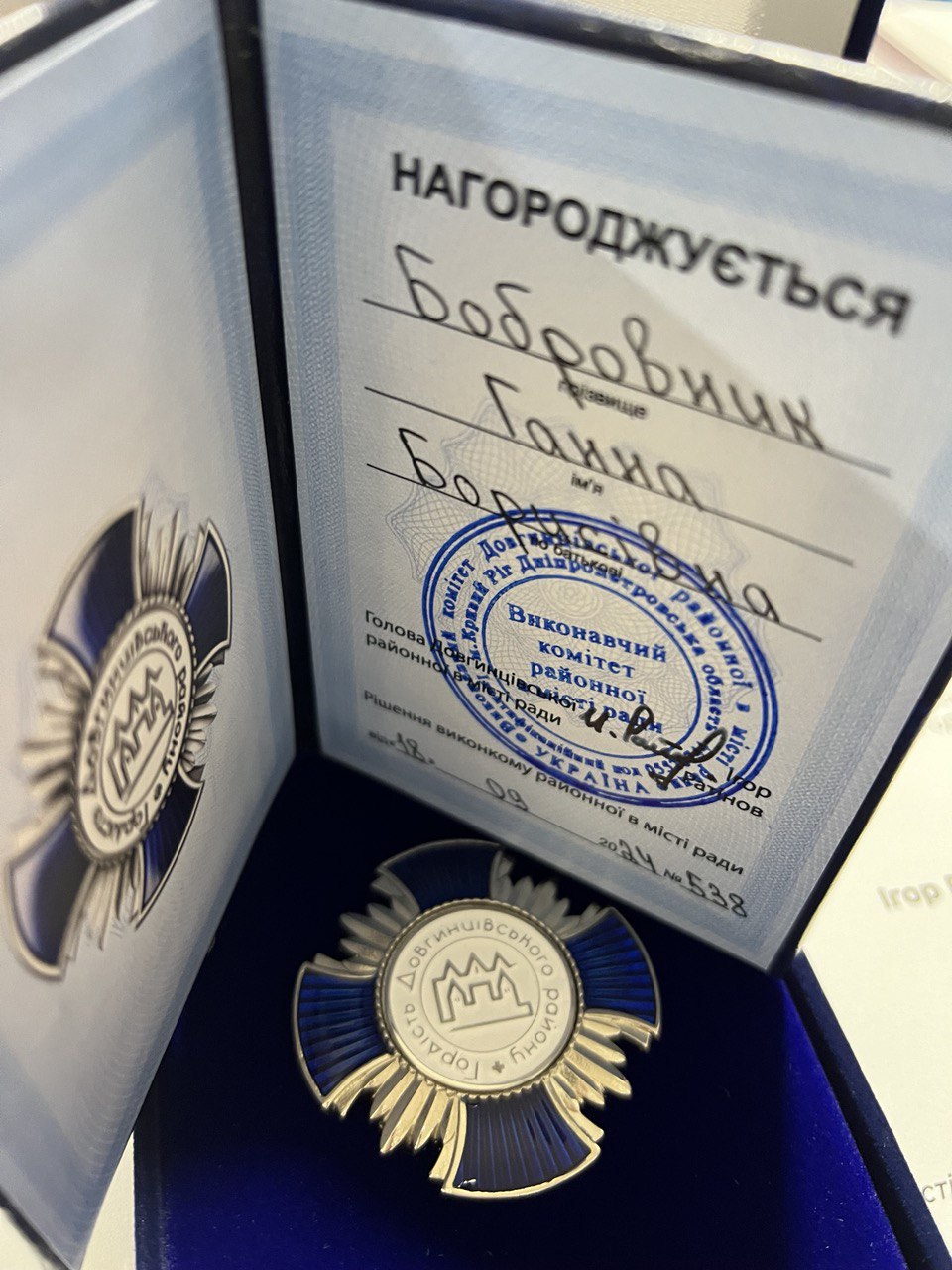 Нагрудним знаком «Гордість Довгинцівського району» нагороджено Бобровник Ганну, практикуючу педагогиню з 16-річним стажем, яка з 2020 року проходе військову службу у Збройних Силах України. З початком повномасштабного російського вторгнення в Україну Ганна продовжила військову службу у 92 окремій механізованій бригаді оперативного командування «Схід» (з 2023 р. - 92 окрема штурмова бригада імені кошового отамана Івана Сірка) та виконує бойові завдання на гарячих напрямках.
