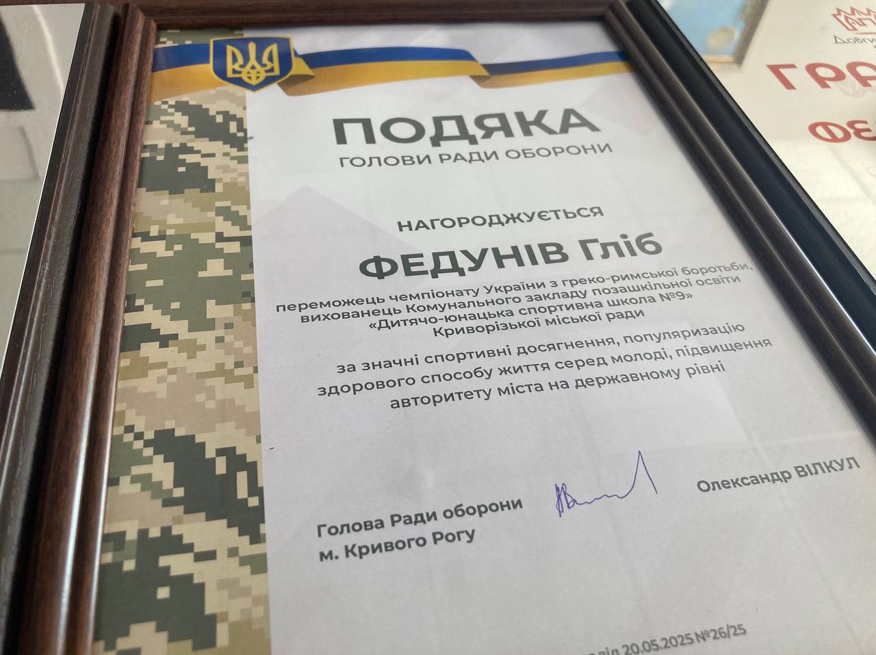 Сьогодні від Голови Ради оборони міста Олександра Вілкула вручено Подяку 15-річному спортсмену Глібу Федуніву, вихованцю ДЮСШ №9, який здобув І місце на Чемпіонаті України з боротьби греко-римської (м. Тячів, Закарпатська область) та буде представляти Україну на Чемпіонаті Європи в Італії. Нашого Чемпіона також відзначено Грамотою виконкому районної в місті ради.