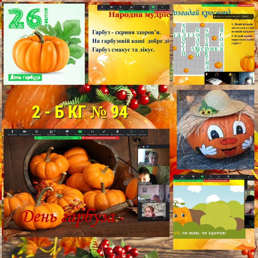 Сьогодні у Криворізькій гімназії № 94 пройшов цікавий захід в онлайн форматі «День Гарбуза». Дітки ознайомилися з походженням овочевої культури - гарбуз, цікавими фактами , традиціями та обрядами, які існують в світі та Україні; з народною творчістю, де гарбуз є головним героєм.