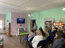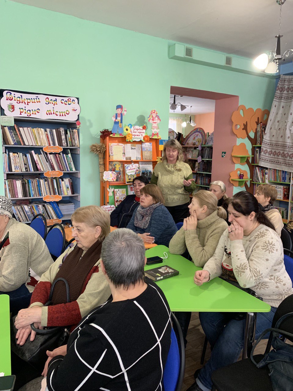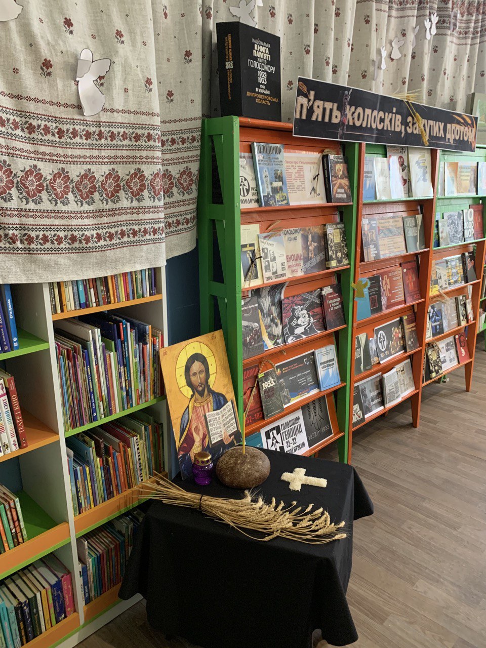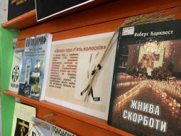 (фото: панорамна виставка-реквієм «Три колоски закуті дротом» до Дня пам’яті жертв Голодоморів, бібліотека-філіал №10 Комунального закладу культури "Міська дитяча бібліотека" Криворізької міської ради).