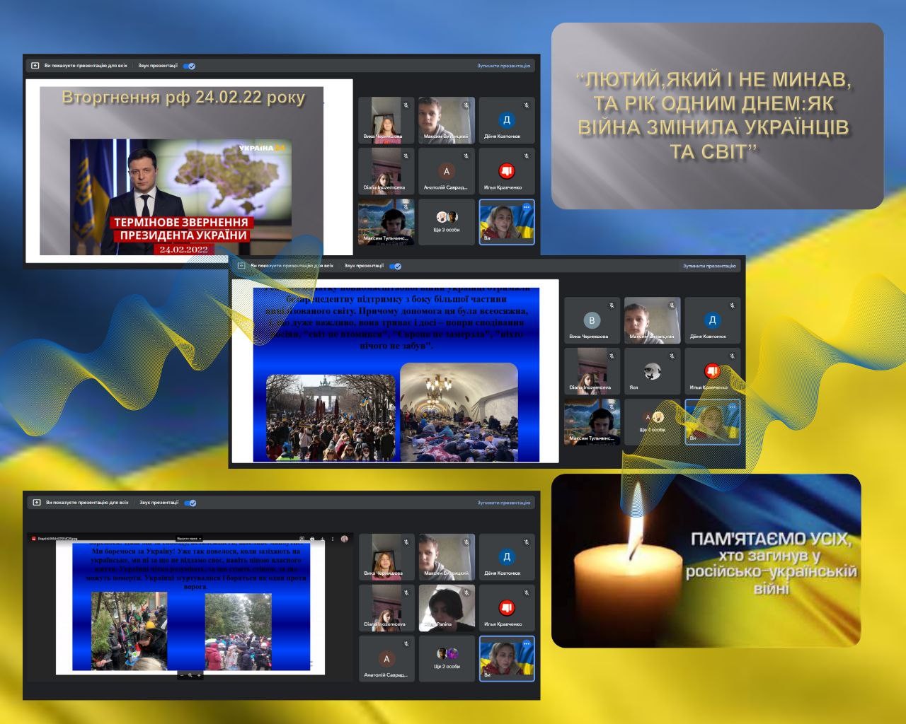 З метою вшанування мужності та героїзму народу України у відсічі збройної агресії рф, 23.02.2023 – 24.02.2023 у закладах освіти Довгинцівського району пройшов єдиний виховний захід до річниці повномасштабного вторгнення та збройної агресії рф проти України за темою "Лютий, який і не минав, та рік одним днем: як війна змінила українців та світ".