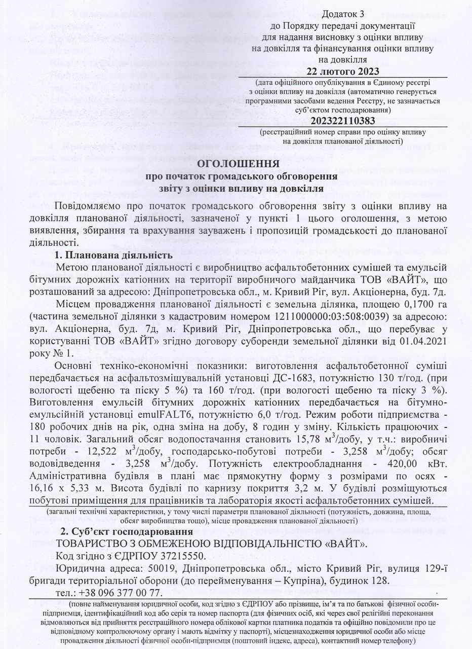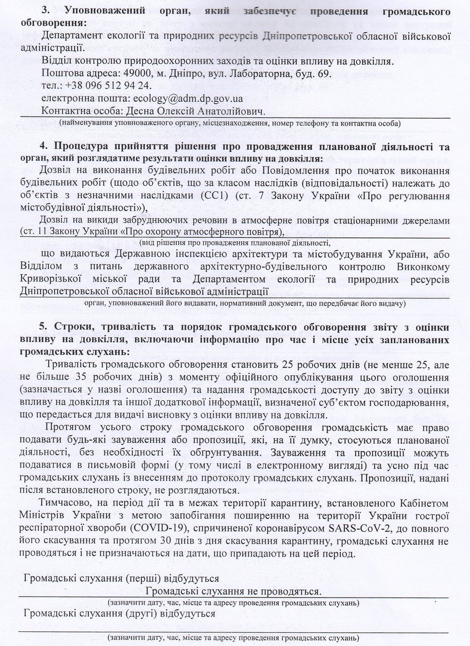 Оголошення про початок громадського обговорення звіту з оцінки впливу на довкілля