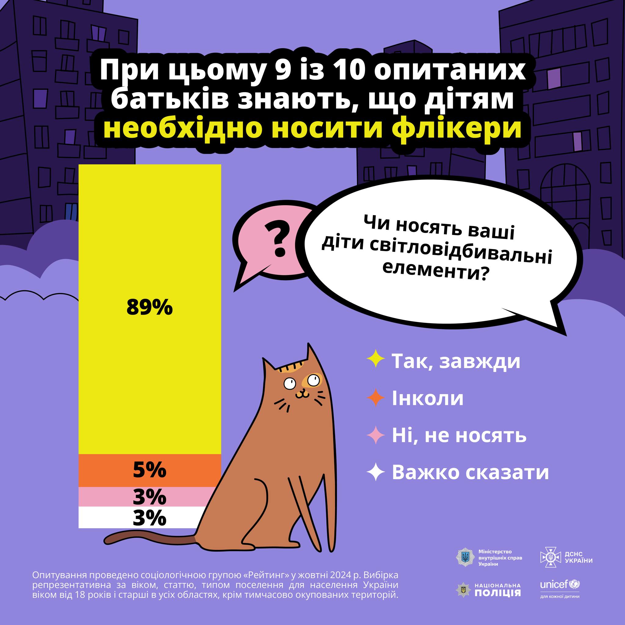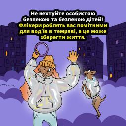 Тому нагадуємо: простий флікер на одязі, рюкзаку, сумці, рухомих частинах тіла — ефективний захист для дітей і дорослих у темну пору доби!