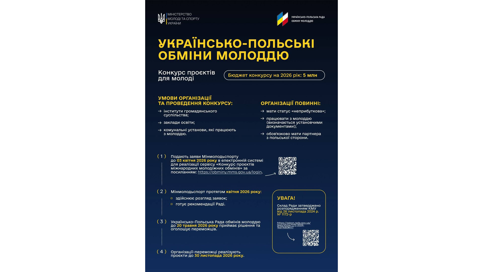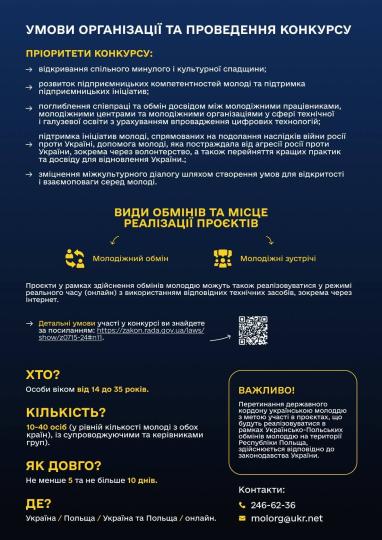 Детальніше про умови — https://mms.gov.ua/news/ukraina-polshcha-startuvav-konkurs-proiektiv-molodizhnykh-obminiv-na-2026-rik.