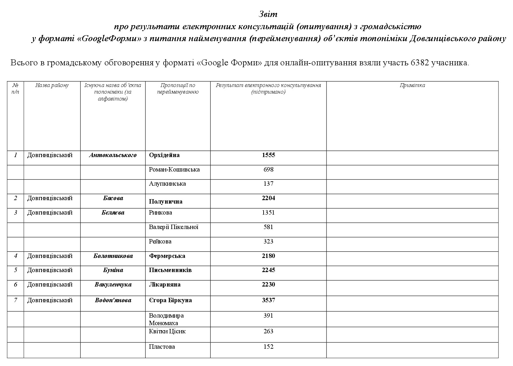Звіт про результати електронних консультацій (опитування) з громадськістю у форматі «Google Форми» з питання найменування (перейменування) об’єктів топоніміки Довгинцівського району.