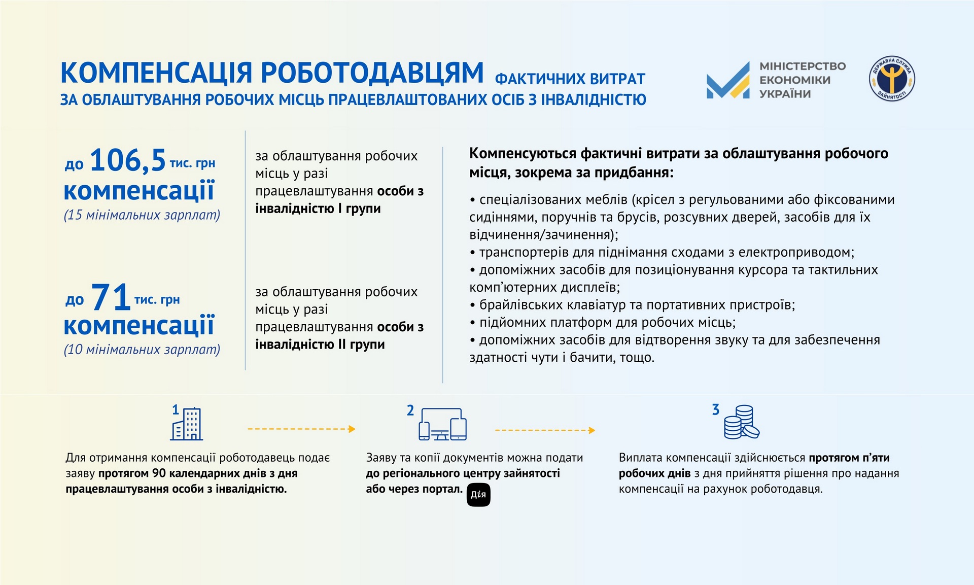 Роботодавець має облаштувати робоче місце для фахівця з інвалідністю впродовж 90 днів з моменту працевлаштування. Далі він подає заяву про надання відшкодування вартості витрат до центру зайнятості або через портал Дія та додає копії необхідних документів. Розгляд справи займає 10 робочих днів. У разі позитивного рішення, протягом 5 днів кошти надійдуть на рахунок роботодавця. Погодьтеся, десь стільки ж займає офіційне працевлаштування.