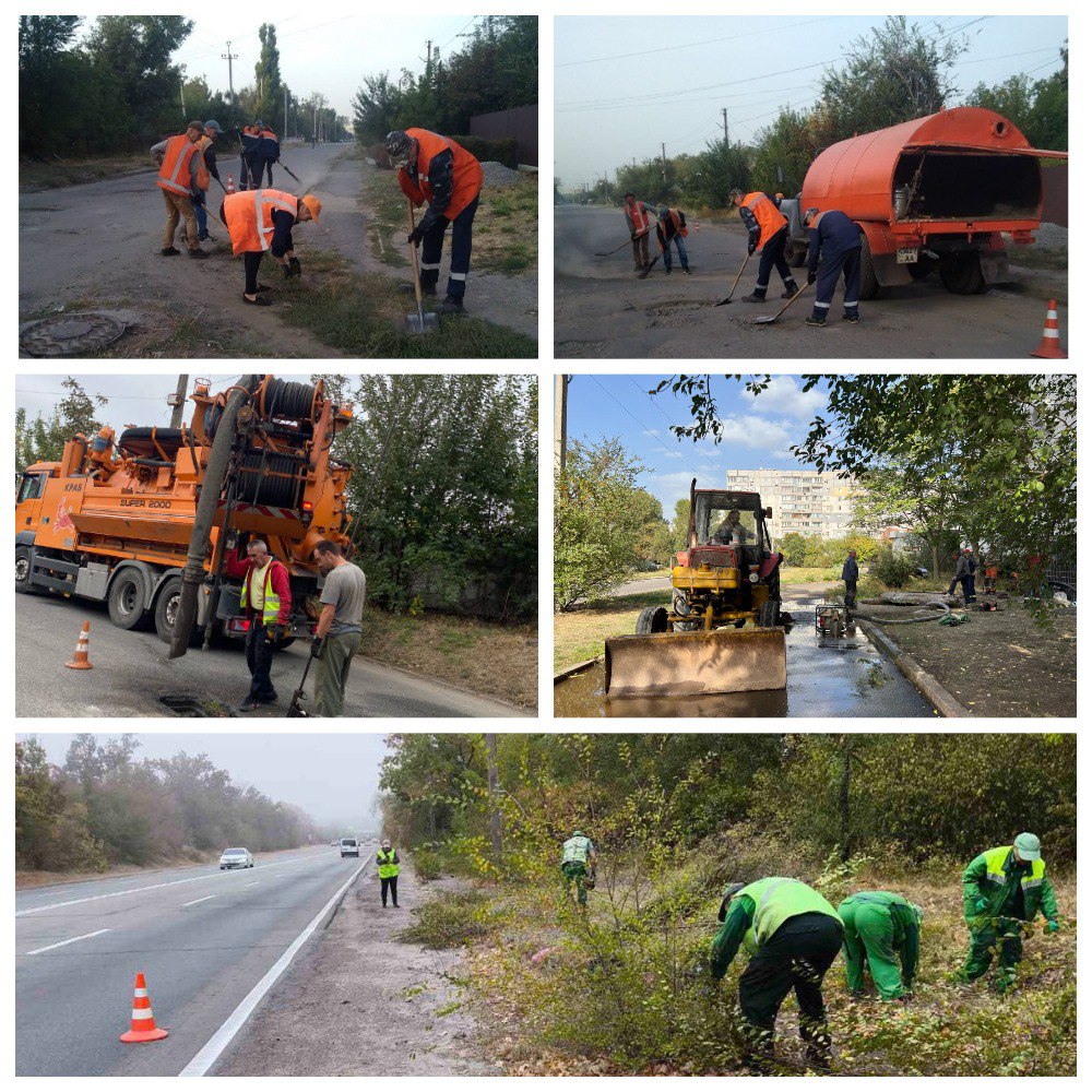 Виконуються роботи з благоустрою та усунення аварійності на мережах водопостачання, очищення дощових стоків автомобільних доріг, відновлювальні роботи після заміни труб тепломережі; прибирання автошляхів, територій загального користування, вирубка парослів.