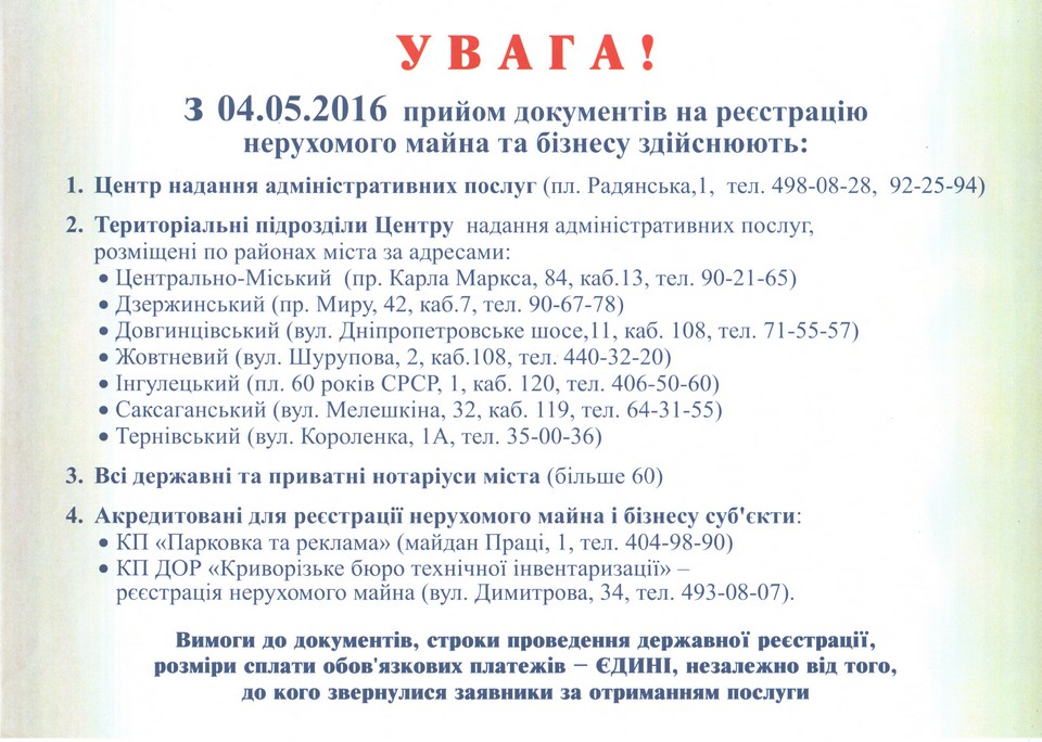 Увага! З 04.05.2016 прийом документів на реєстрацію нерухомого майна та бізнесу здійснюють